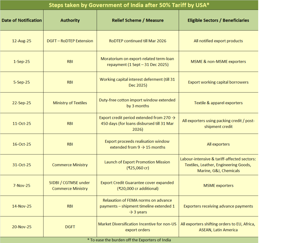 After the 50% tariff by USA on Indian goods, the government of India has taken several steps to help ease the exporters’ burden, losses and perils.