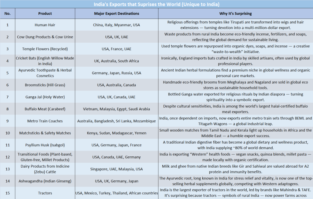 Few realize India leads in psyllium husk, buffalo meat, and human hair, commanding dominant global market shares. -